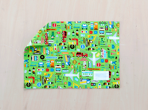 ランチョンマット氏名票つき縦26cm横37cmいろいろな車、ひこうき、電車道具など男の子が大好きなものいっぱいのプリントグリーン 811裏は共布